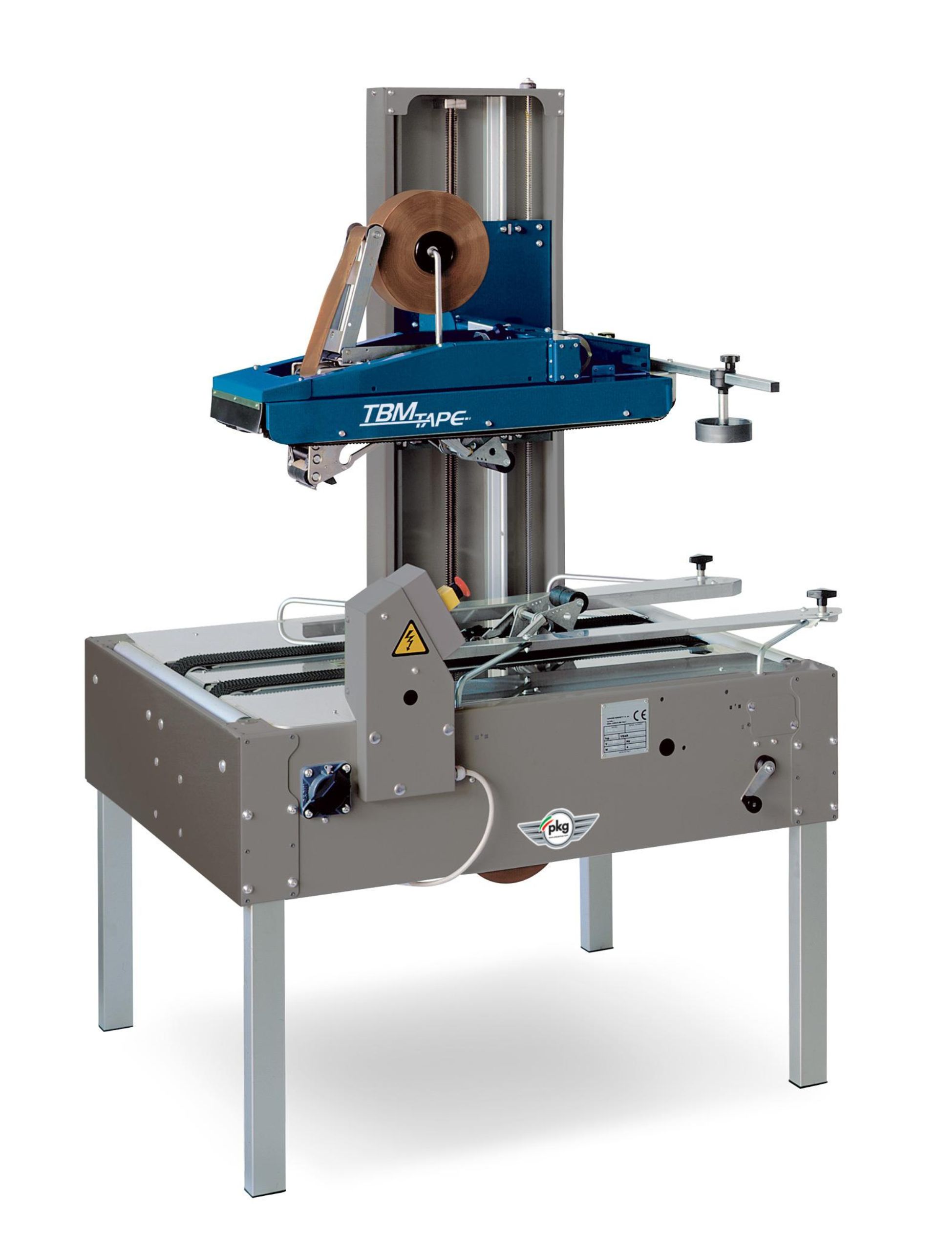 TBM Tape ist die halbautomatische Verklebemaschine mit oberem und unterem Vorschub, die die Ober- und Unterseite von Schachteln mit Klebeband verschließt. Das Schachtelformat wird manuell eingestellt.