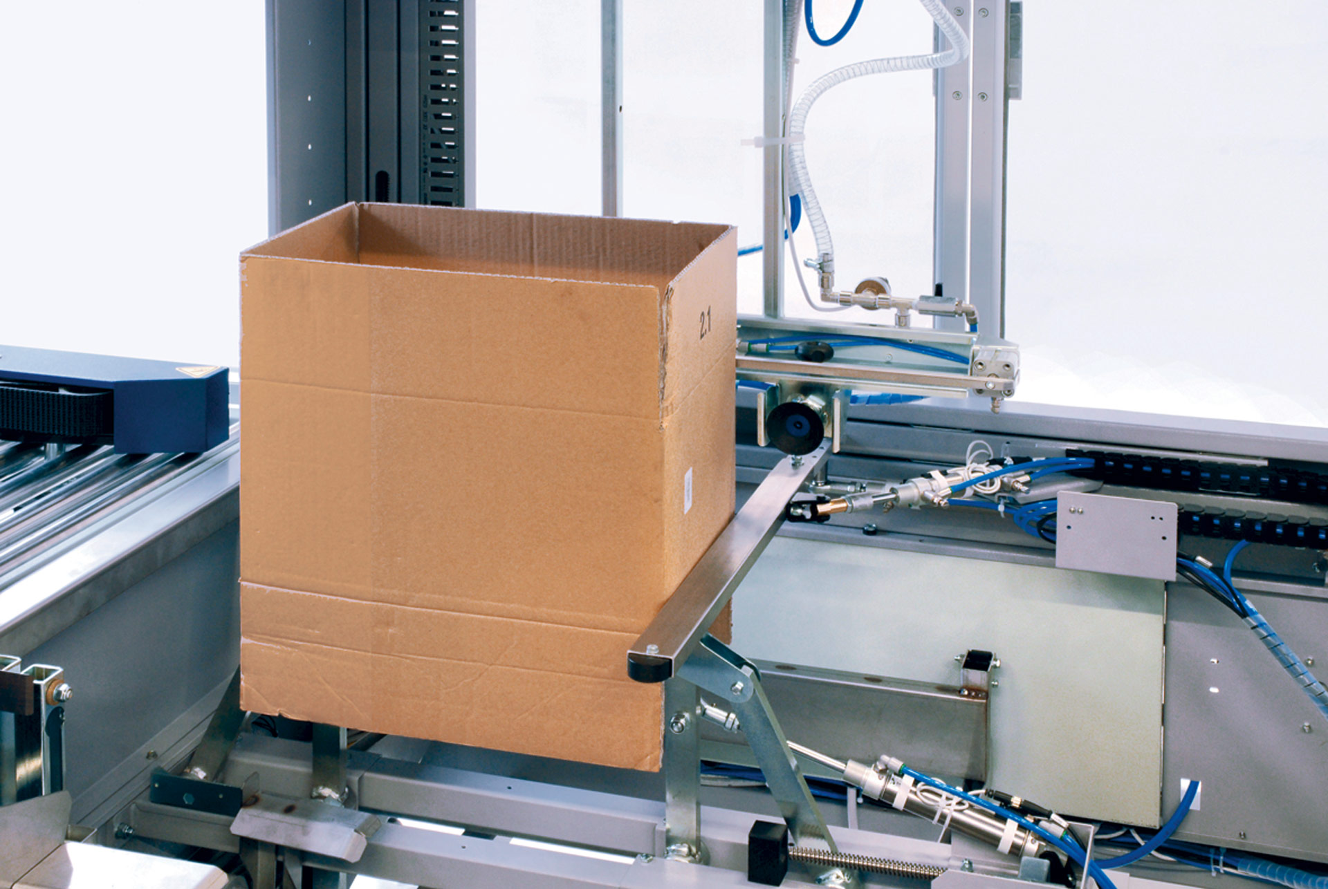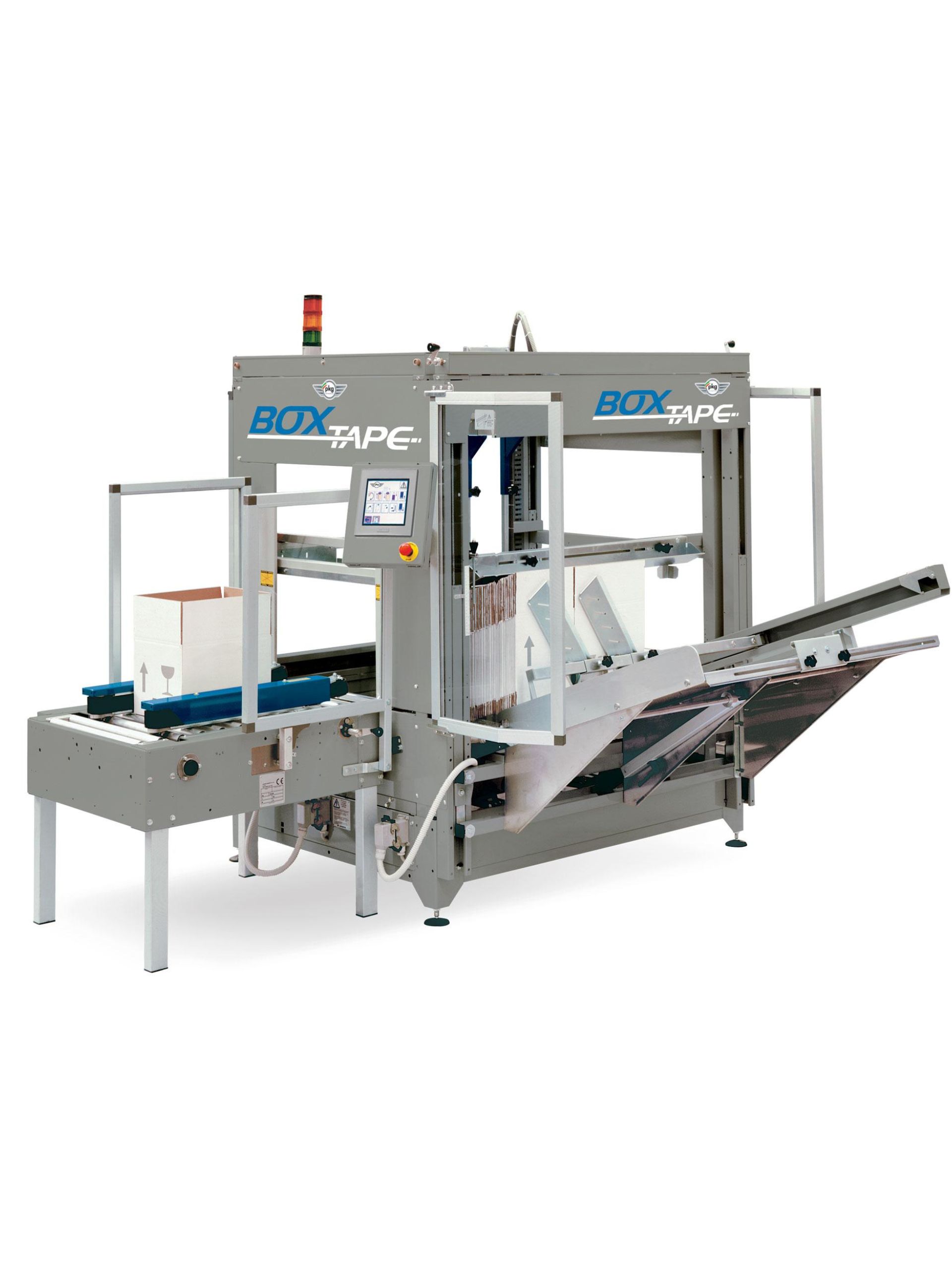 Box Tape, простая машина с быстрой регулировкой формата коробки, забирает их из бокового магазина, сгибает четыре нижних клапана, после чего коробка заклеивается (по заказу) и готовится к наполнению.